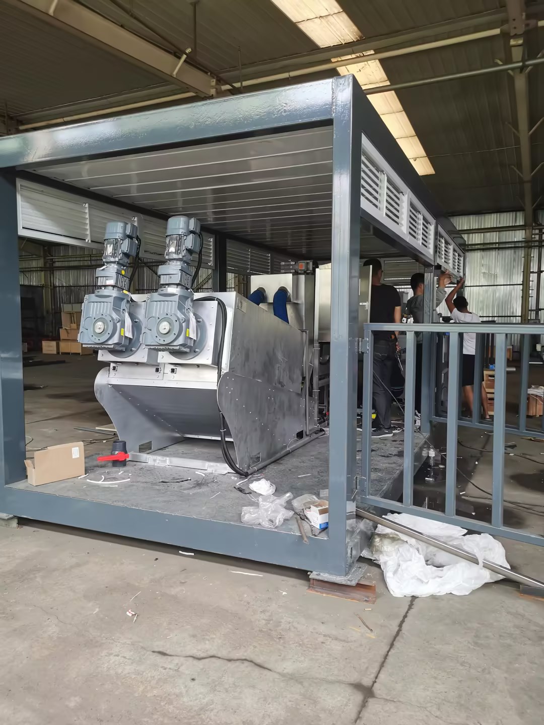 - 把疊螺污泥脫水機(jī)的各個部件,如疊螺機(jī)和三槽加藥裝置、污泥泵、加藥泵等集成在一個集裝箱內(nèi),形成一個完整的污泥脫水系統(tǒng)。這種高度集成化的設(shè)計,使得設(shè)備的結(jié)構(gòu)緊湊,占地面積小,便于運輸和安裝。
